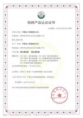 2018年2月10日至11日,宝工公司YFG-300、YFG-500 两种型号液压复轨器通过了中铁检验认证中心(CRCC)第二次年度监督审核。