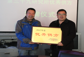 1月20日,中国电子科技集团公司第三十九研究所装备制造部主任陆源一行三人专程为公司送来了“优秀供方”牌匾,感谢公司多年来在天线座架等项目制造中为三十九所提供的优质产品与服务。在公司第二会议室举行的授牌仪式上,副总经理赵勐、总工程师张宁向陆源一行介绍了公司的场地、设备、产品及研发团队情况。陆源向公司颁发了“优秀供方”牌匾。