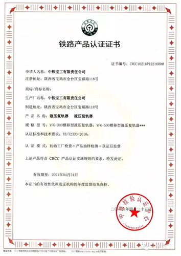 我公司YFG系列液压复轨器产品此次通过CRCC认证,表明我们的产品已经正式得到进入铁路行业的通行证。为公司复轨器产品的市场拓展扫清了障碍。