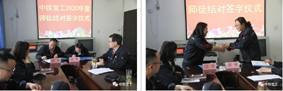 结对仪式上,乔素兰总结了公司近年来师徒结对取得的成果,对师傅们的辛勤指导表示感谢,向多年来在师徒结对活动大家成长进步和所取得的成绩表示祝贺,并针对2020年师徒结对活动提出具体要求。现场来自各基层单位的6对结对师徒代表举行了简单而不失庄重的拜师礼仪。大家郑重地在师徒协议表上签下各自姓名,让承诺牢记心中。