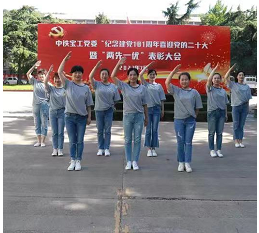 五、跳支红舞。红星是咱工人的心,党的光辉照万代。由机关一、机关二支部党员联合表演舞蹈《红星闪闪》。